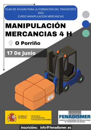 O Sábado 17 de Xuño de 2023 celebraráse en O Porriño un novo curso de Manipulación de mercancías (4 horas), gratuíto para traballadores do sector transporte, subvencionado polo Ministerio de Transportes y Movilidad Sostenible ao amparo do Plan de Axudas para a formación do transporte 2022.